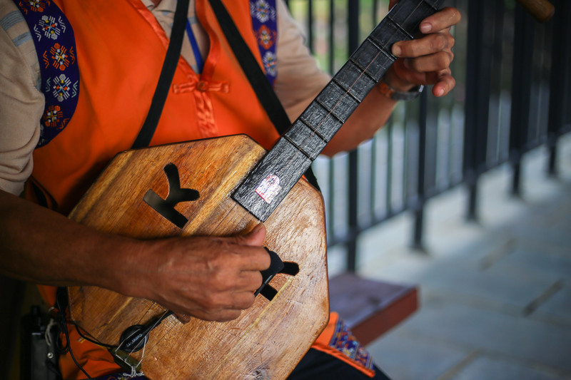 桥上坐着四位长者,用黎族特有的乐器演奏着欢快的音乐,以表示对游客的欢迎,因为时间还早,(我不会说我是那天第一个入园的)他们演奏的间隙,我问询长者这叫做什么乐器?但是他们说的都是方言,我实在是猜不出来。