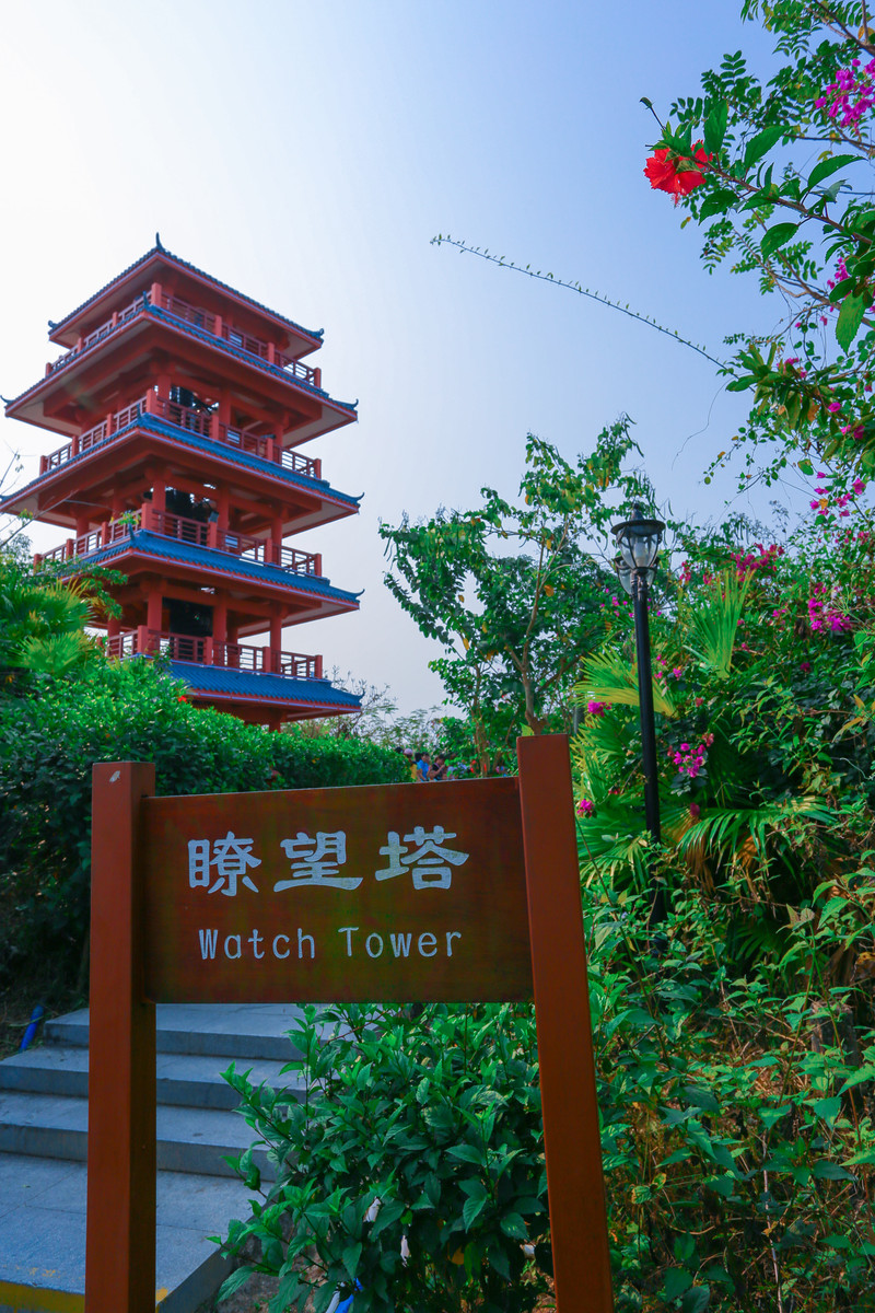 沿着线路图一路走到了瞭望塔,据说这座五层塔楼高的建筑是观赏三亚市景的绝佳之处,虽然它不是最高处却足以俯瞰整个三亚湾的美景,视野极其开阔,绝对是拍摄三亚全景的最佳视角。
