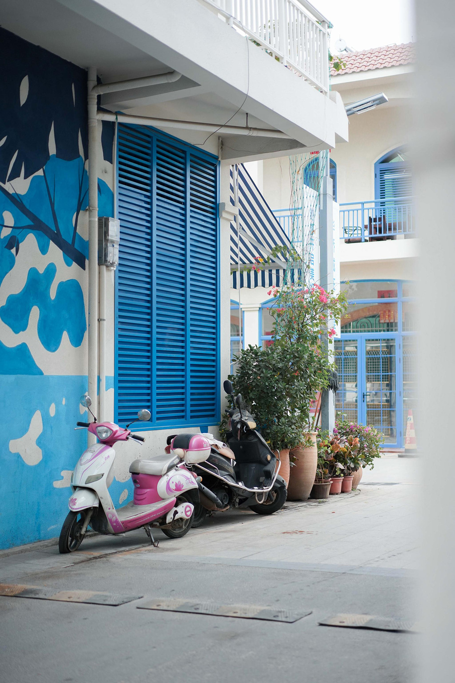 镇上的所有房子都是白色,门扉和格窗都刷上了蓝色,门前屋后都有许多花花草草,三三两两的电动车停在路边,偶尔有居民骑着车经过,整个小镇非常清新、温暖。这里被称为三亚的圣托尼里,因为到处都是白色的房子和蓝色的窗户,街道上都是这种蓝白风格的建筑,所以很容易拍出好看的照片。