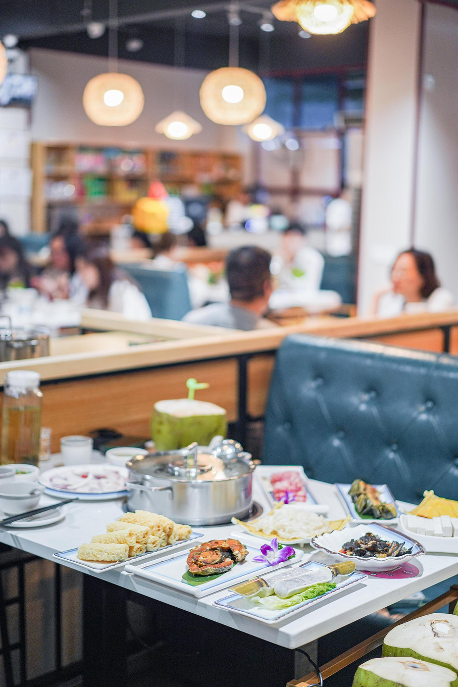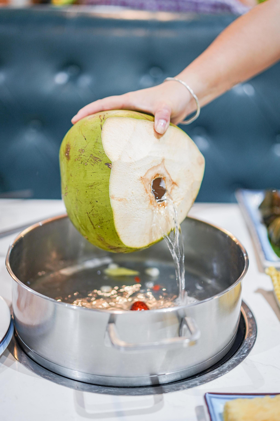 首先锅底就非常棒,️3个椰子+️1瓶矿泉水,都是等客人上桌后再倒椰子水,新鲜看得见,新鲜椰子水甘甜清爽,用它煮出来的椰子鸡更是清甜。锅底还会添加马蹄、椰肉条、木瓜等,锅底非常清甜,吃之前记得先喝汤哟~