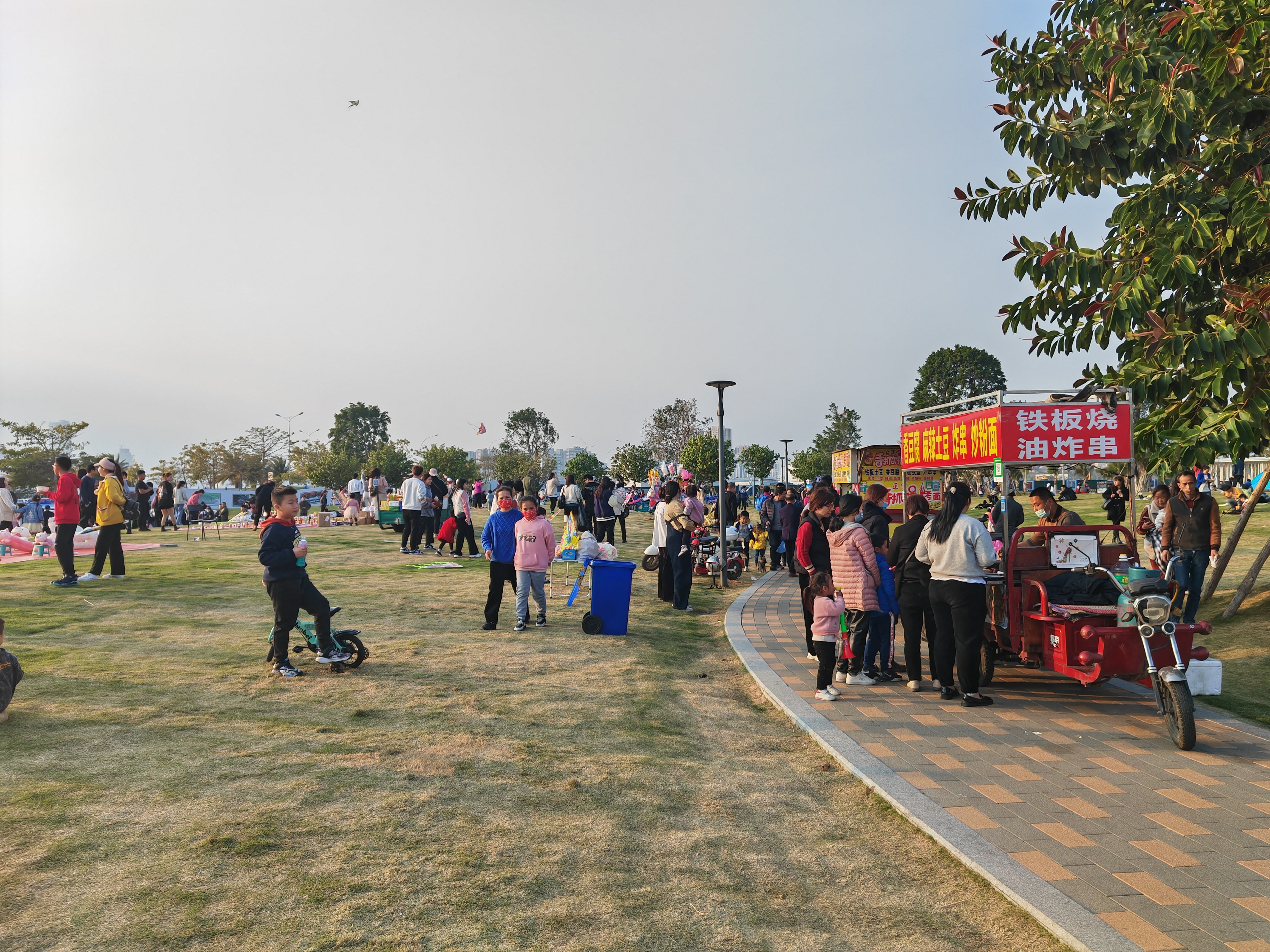 令人感到意外的是公园大门前停车场的绿地上,现场可谓人山人海。大部分都是自驾游的市民,草坪上到处都是席地而坐的人。同时,现场还有很多美食摊,各种各样的美食,现场还有唱歌的,套圈的,整个现场热闹得不得了。