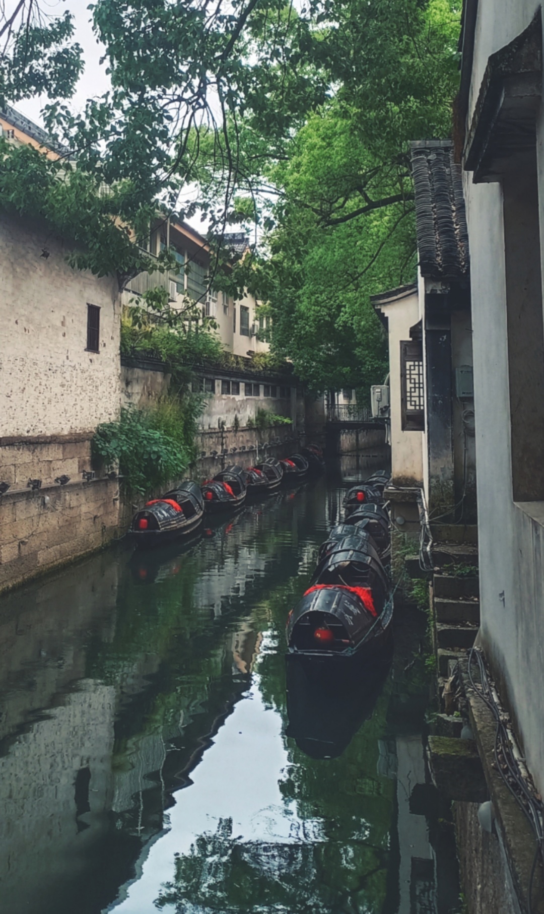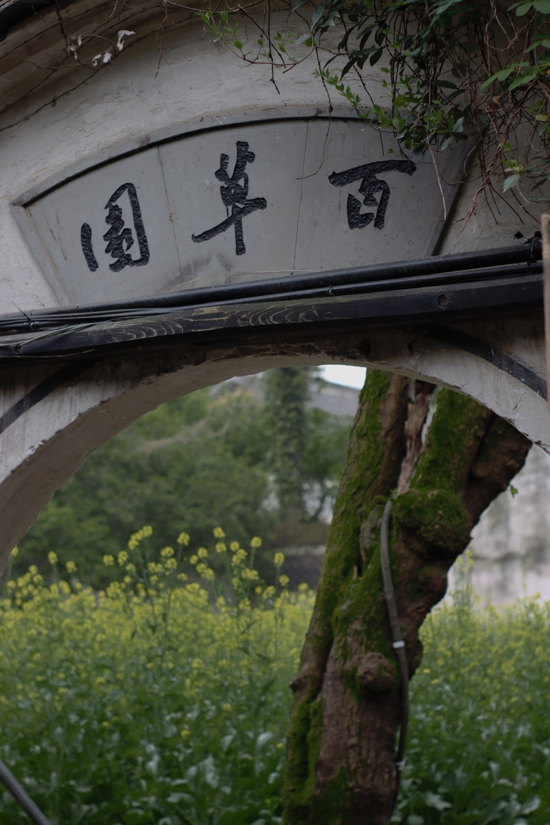 与祖屋隔着河道的是三味书屋。河道虽窄,却三三两两停着乌篷船,远处一道青石桥横跨河道上,桥身上墨绿的苔藓与藤蔓交织缠绕,再加上那突如其来的雨,活脱脱一幅江南烟雨百景图。