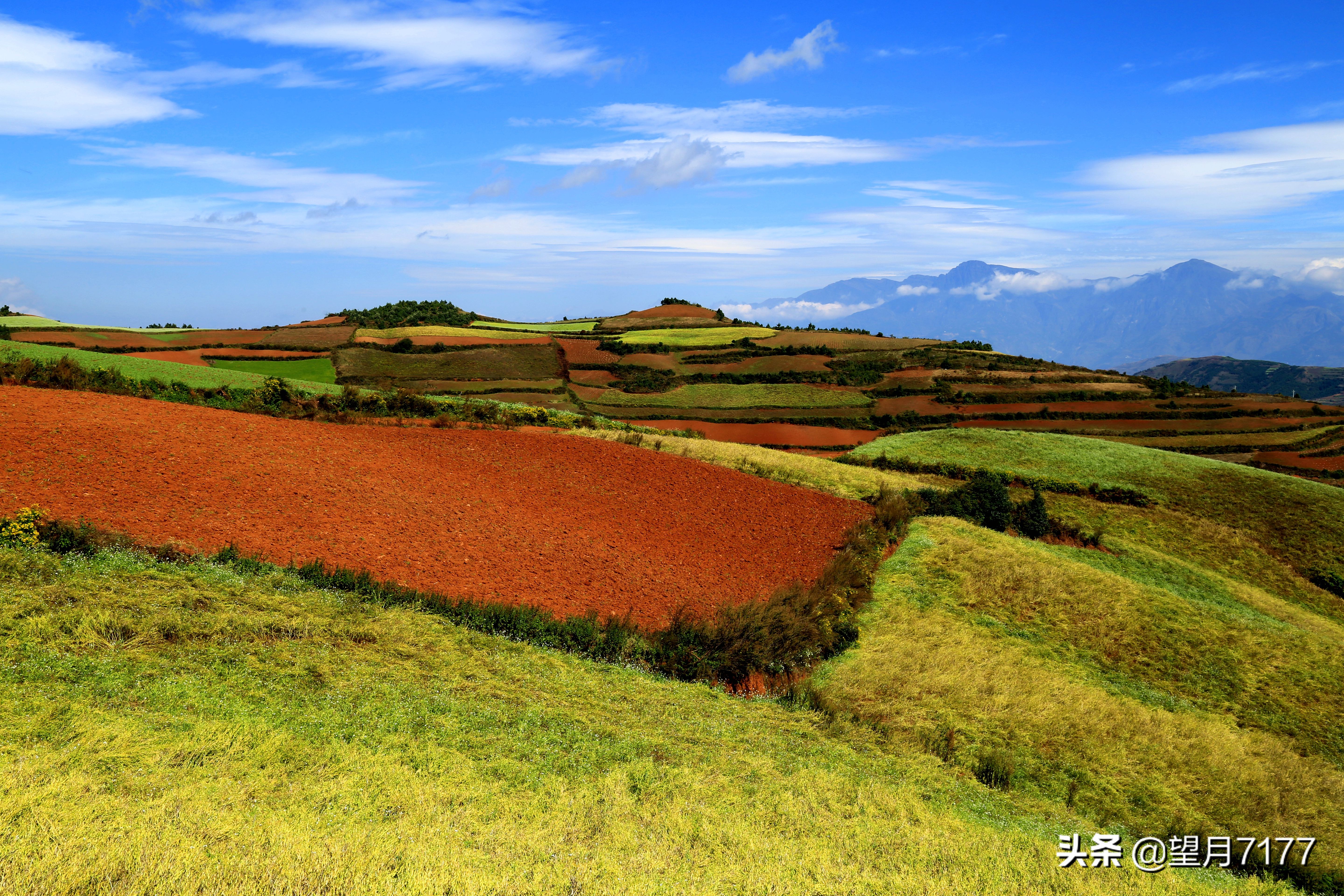 那碧绿的庄稼,洁白的菜花,火红的土地,以及那独一无二的形状,优美的线条,衬以蓝天白云和变幻莫测的光影,远远望去,犹如从天际挥洒而出的七彩霓裳。