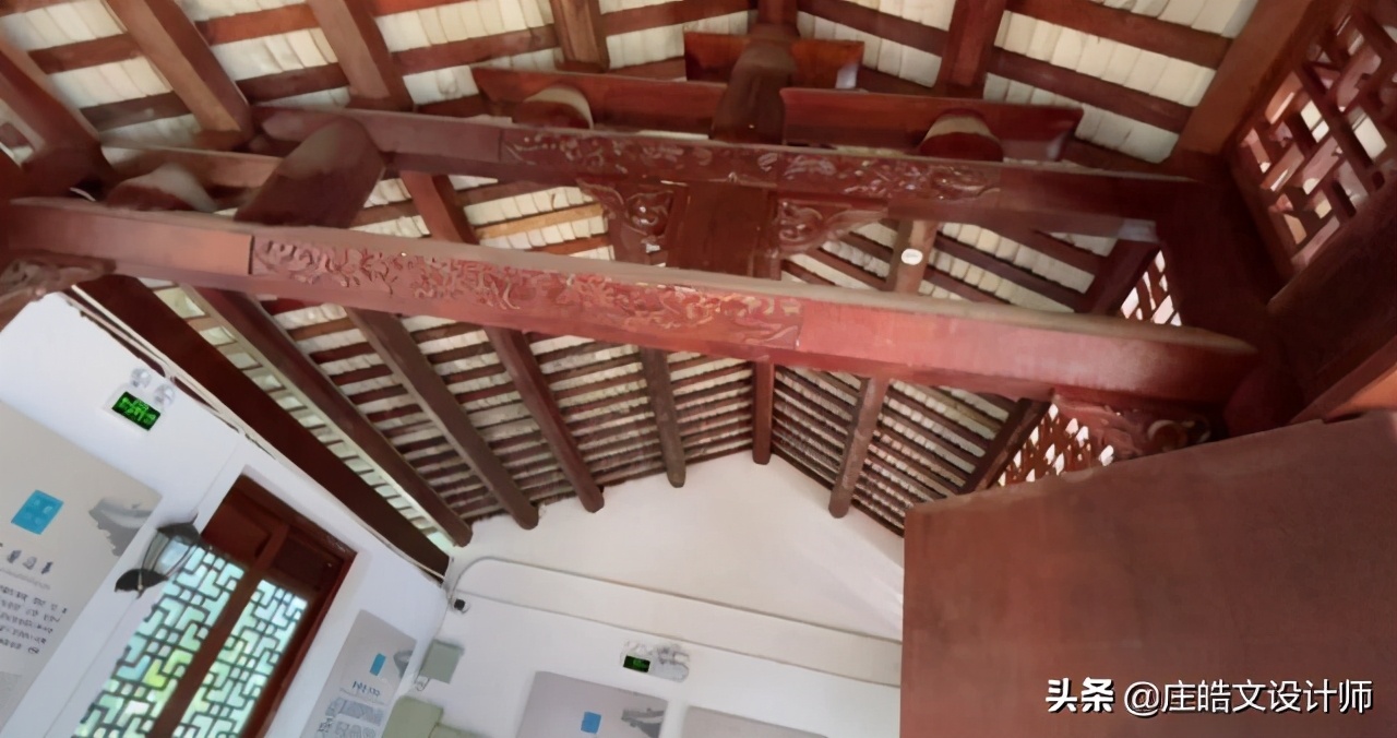 进入建筑内部发现有很多的细节设计很考究,房梁柱上是有中式设计元素缠枝花造型的设计。或许这些设计体现在不同规格跟功能的建筑当中,代表了它的级别跟定位。