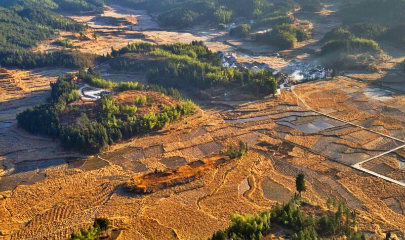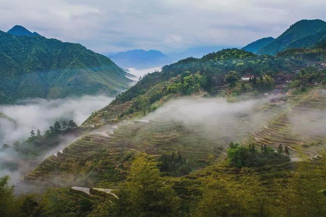 站在 山顶,映入眼帘的是覆卮山的另一个胜景,从山脚到山腰,叠层而上的“千年梯田”,错落有致,宛如一幅古色古香农家山水画卷。