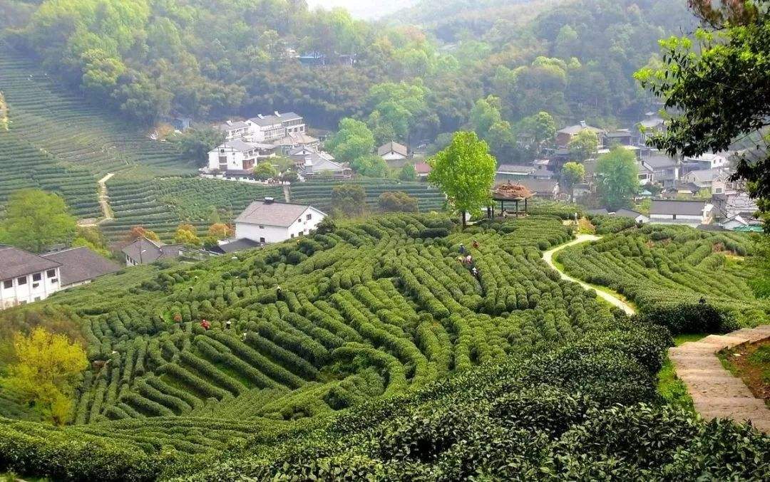 在“十里琅珰”下面,有着六百多年历史的古村静静地坐落于此地,这就是有着“十里梅坞”美誉的梅家坞村,著名的梅家坞茶园,就在村庄周边的山坡上,绿油油的,充满生机。