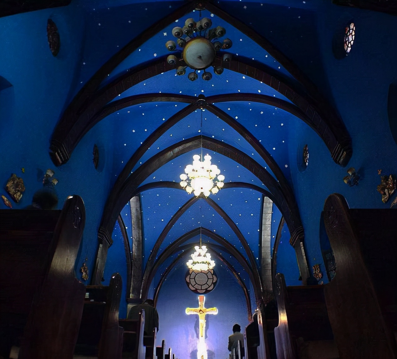 汉口圣母无罪堂,又名汉口"法国堂"。曾经被改造成酒吧,现在又作为教堂对外开放。整个教堂内部是神秘的地中海蓝,蓝白色的满天星,华丽精美。