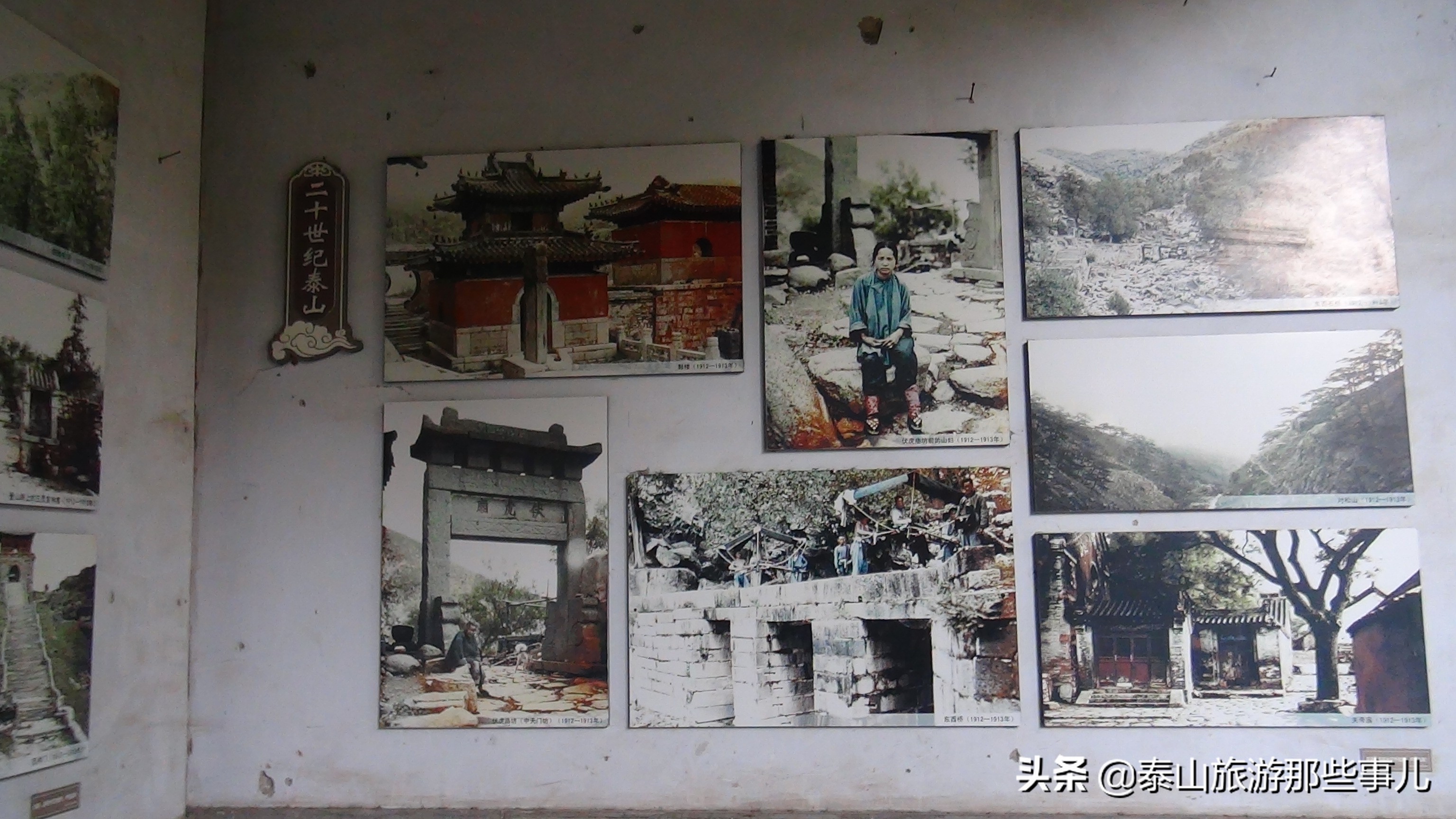 墙壁上大多数是黑白照片。比较难能可贵的是,还存有1912-1913年间的彩色照片,照片中有裹着小脚、疲惫满面的女人,有正奋力前行抬轿的轿夫,有衣着朴素、倚门而望的道人,有成群结队在天街行走的游客,当然还有受人们崇拜的碧霞元君比较原始的塑像,呈现了那个时期的世态众生相。在所有的景点图片中,雄伟的泰山像是少了几分秀丽,斑驳的殿墙、孑孓的盘道、光秃的山顶,更增添了几分沧桑!