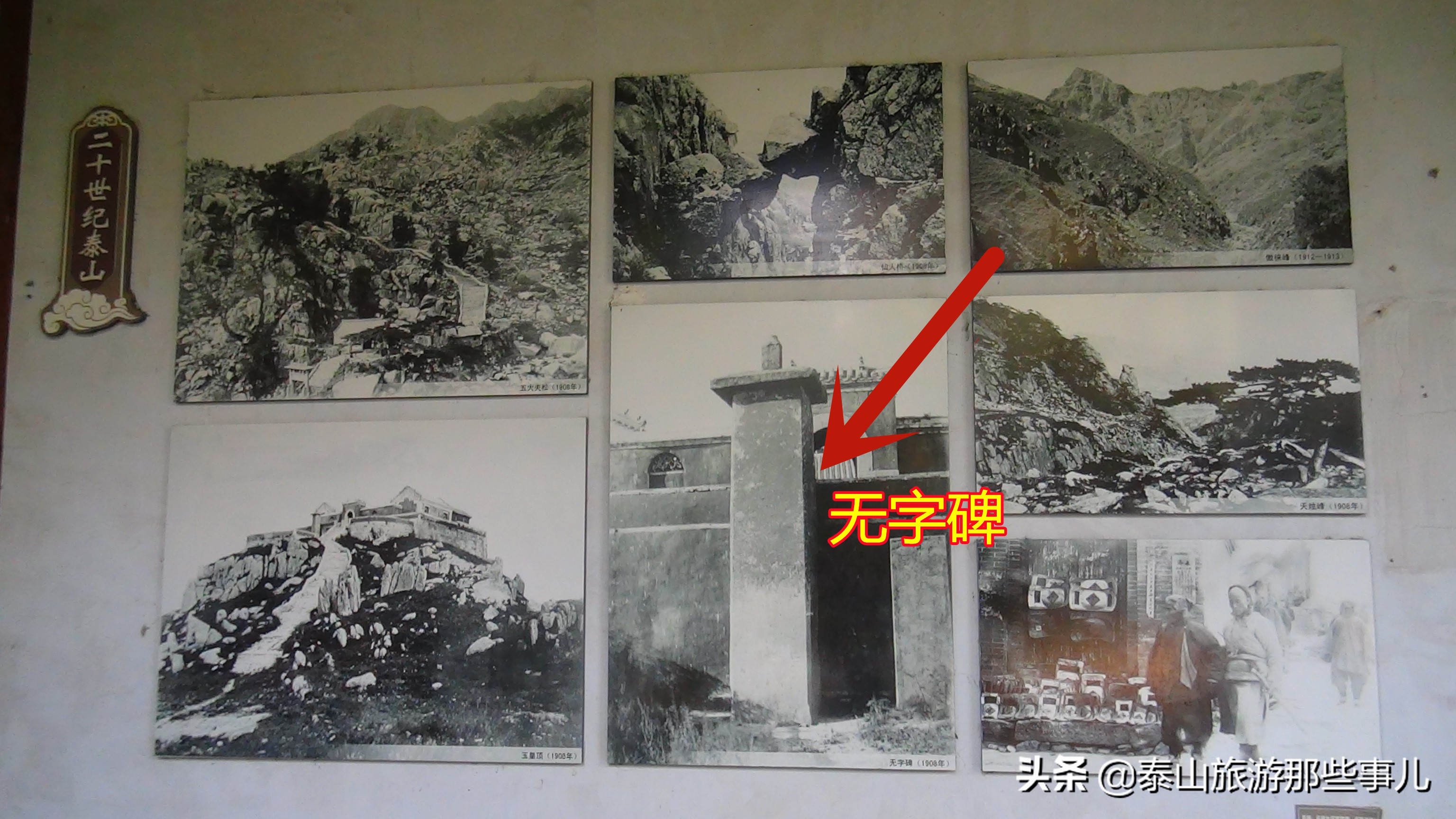 在岱庙仁安门的两侧各有一亭廊,分为南北两面,墙壁上悬挂着20世纪的泰山景貌,几乎囊括了泰山所有的景点,有的景点现已不存,所以说弥足珍贵!有的图片是近代名人、学生、百姓等在泰山上的纪念照,有的是贵妇人被泰山轿夫抬着登山的场景,更多的是著名景点如岱庙、红门宫、经石峪、十八盘、南天门、碧霞祠等等的旧时身影!反映了上世纪泰山的风土人情,观之让人嗟嗟不已。