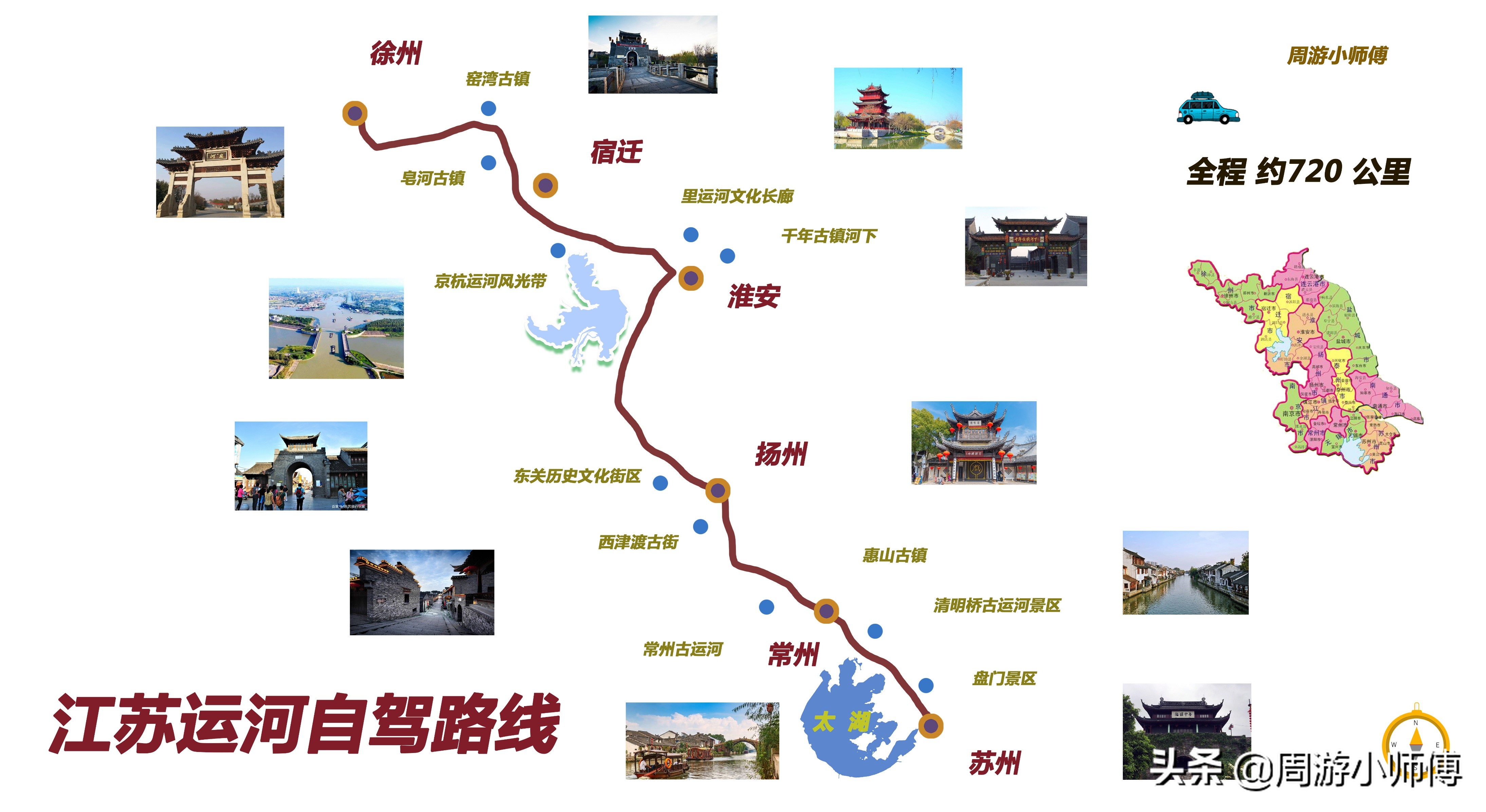 自驾路线:苏州(盘门景区)--常州(清明桥古运河景区、古运河、惠山古镇)--扬州(西津渡古街、东关历史文化街区)--淮安(千年古镇河下、里运河文化长廊)--宿迁(京杭运河风光带、皂河古镇)--徐州(窑湾古镇)