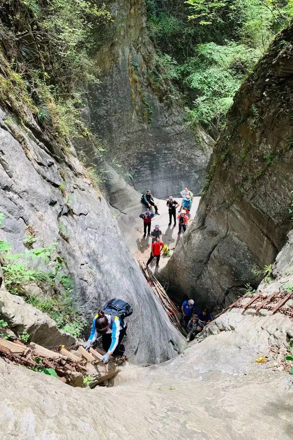 十八缸是南太行徒步穿越的最经典线路,在徒步驴友中久负盛名。蝴蝶谷狭长幽窄,绝壁耸峙,最窄处仅容1人通行,抬头只见一线蓝天,危峰千仞、遮天隐日,风景绝美。十八缸又缸缸相连,景致独特,姿态万千,各有不同。或深、或浅,或如瓮、或如缸,或狭窄、或幽长…其间用木棍、钢丝、铁链、绳索等材质搭建的简易栈道或软梯相连,有时需贴崖而过,有时需攀援而上,有时需钻洞穿行,惊险刺激,使人惊奇不断、流连忘返。