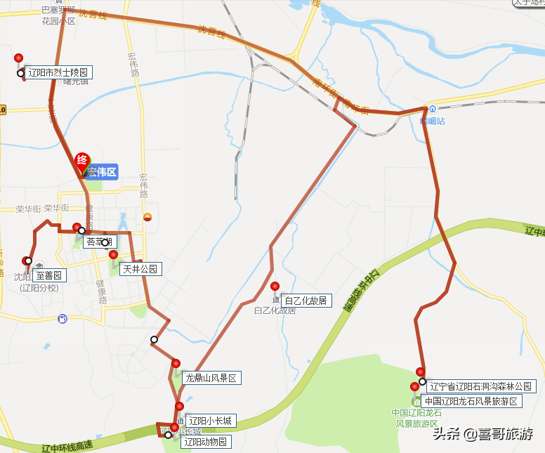 2、辽阳市宏伟区十大景点自驾游行程路线:辽阳市宏伟区-荟萃湖-至善园-天井公园-龙鼎山风景区-辽阳小长城-辽阳动物园-白乙化故居-辽宁省辽阳石洞沟森林公园-中国辽阳龙石风景旅游区-辽阳市烈士陵园-辽阳市宏伟区。