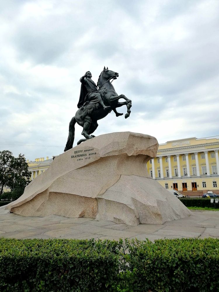彼得大帝骑马雕像,建于1766年至1782年,高5米,重20吨;底座是一块重400吨的花岗岩,是目前世界上纪念性雕塑艺术最完美的作品之一。骏马前腿腾空,彼得大帝安坐在坐骑上,两眼炯炯有神,目视前方,充满信心,严厉而自豪。