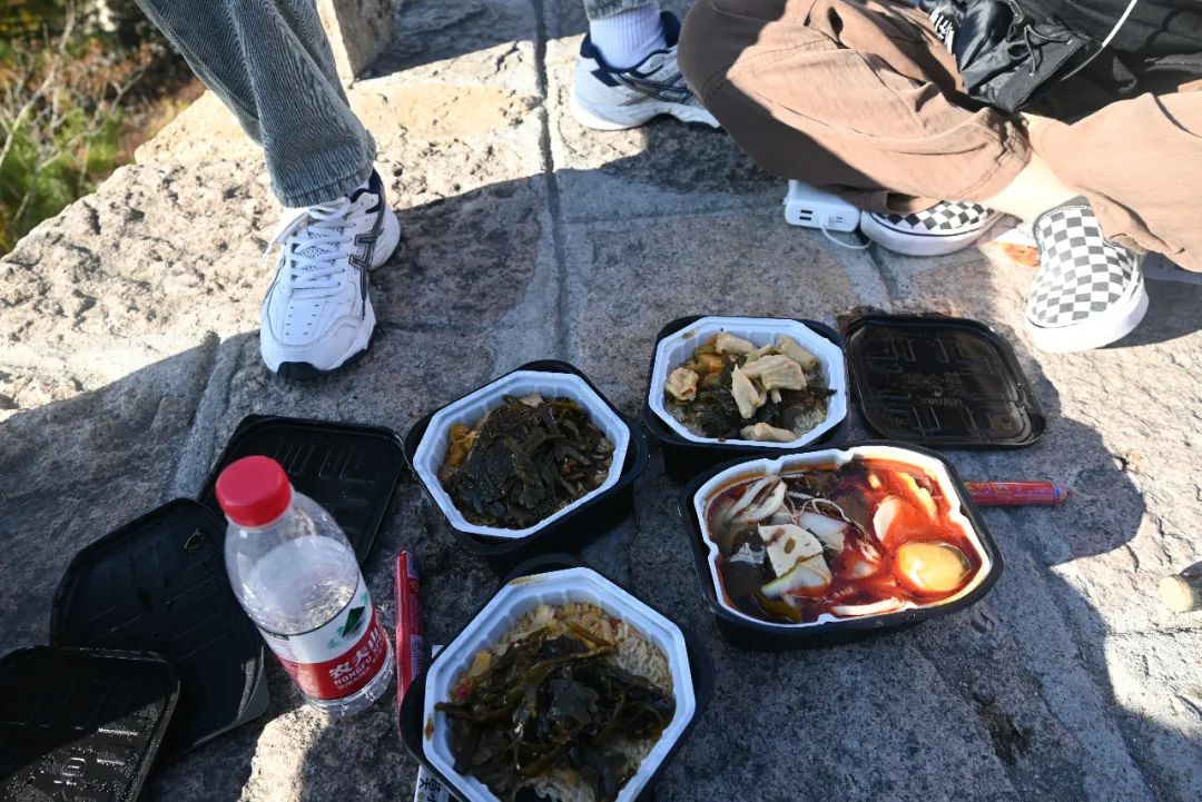 爬上来有点累大家都坐着休息吃东西,结果上来一个大叔说:你们这就累啦?