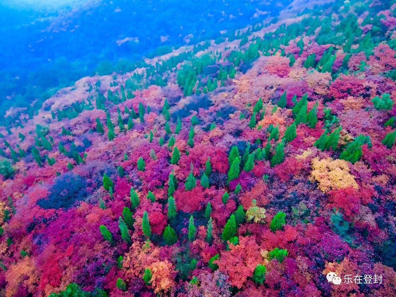 霜打红叶叶更红,落叶松的金黄耀眼、杨树的温婉暖黄都被黄栌树火红的色彩一点点遮盖住,形成了一幅红叶漫山红似火的壮丽画卷,美不胜收。