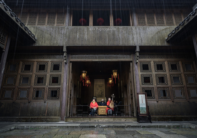 这样的场景让人想起 同里 古镇,同样的四方天井,木屋细雨如帘。