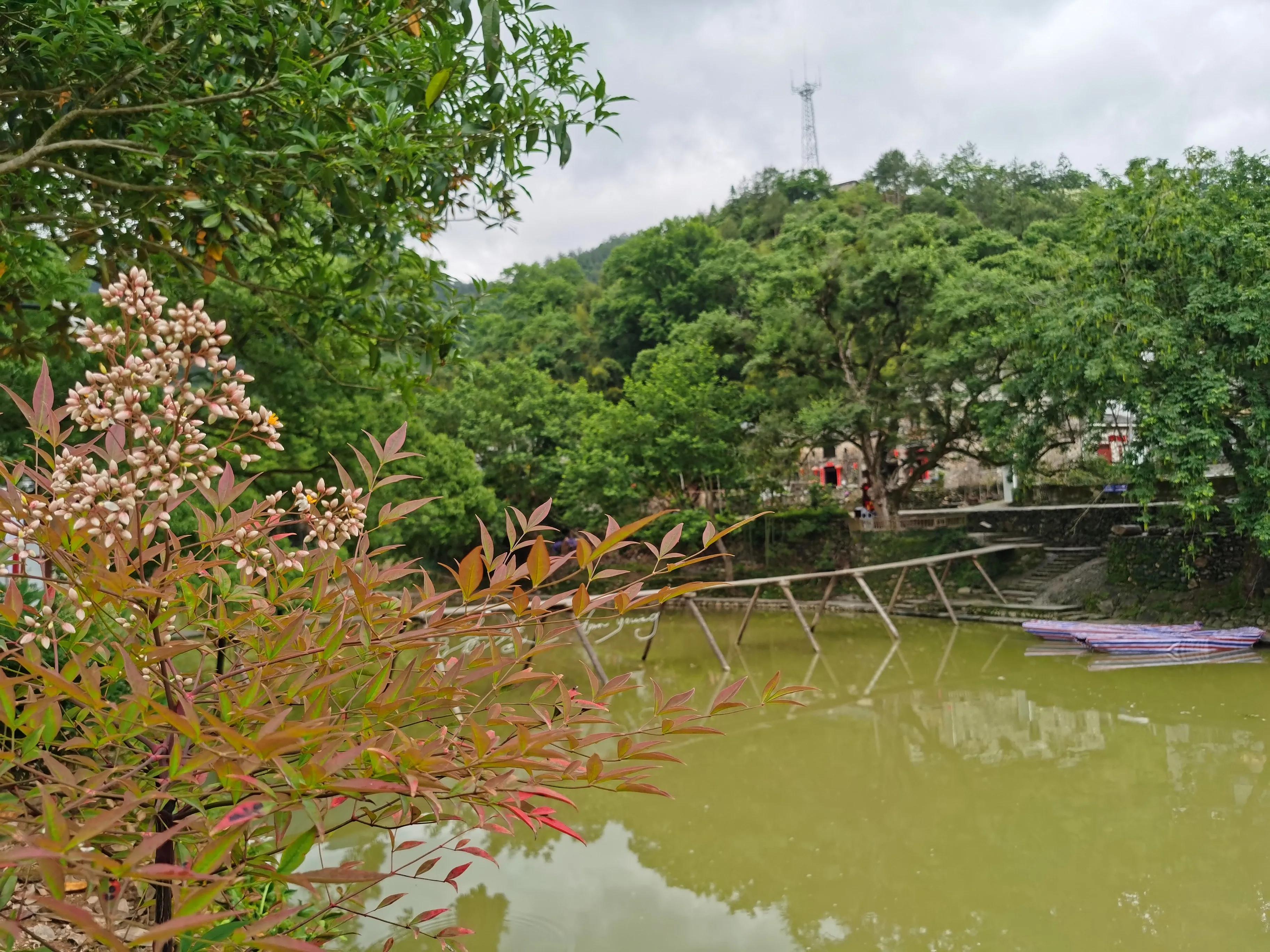车行驶到景区大门后,步行百米就到古镇了。只见一条碧绿的瑶河蜿蜒盘旋,缓缓流淌。两岸均是明清时期的徽派古建筑,粉墙黛瓦,错落有致。近处绿树婆娑,爬藤纠结;远方青山起伏,云遮雾绕。细密的小雨时下时停;大黄狗趴在青石板上沉沉睡去;大公鸡“喔喔喔——”地叫着;几位白发老人坐在树下细话桑麻……鸡犬之声相闻,村民不知魏晋,说的就是这里吧。