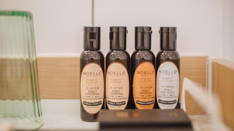 卫生间的格局是我喜欢的,简单的白色瓷砖,搭配金金属色系的台盆,更重要的是有两个台盆,两面台上镜,可以跟老公同时刷牙洗脸。酒店定制的一次性用品也很用心,澳大利亚血统的NOELLE一般只出现在高端精品酒店里。