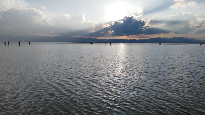 在走到快到湖中心时,我们脱了鞋,下了湖。因为这里几百平方公里的湖水都不深,深度都是刚没过脚面,脚底下就是平平整整的,盐走在上面特别舒服,我一手拿着相机一手拿着DV,口袋里还装着手机准备照相。生怕漏掉一处美景。下到湖里面后我们一直往里面走,还碰到了一对在湖里拍婚纱照的夫妻。我想能在这里拍婚纱照一定会是很美的。走在茶卡湖里,就犹如走进了盐的世界,天空白云悠悠,远处山暖重叠,加上夕阳西下,简直如诗如画。茶卡盐湖还被人们成为中国的“天空之镜”,在风平浪静的时候,就犹如一面超级大镜子,照的天上一览无余。在湖里除了拍照片还是拍照片,因为很想把这里的美景都装回家。媳妇儿在湖里一直在给我抱怨,因为她没有带上她的白色连衣裙,看着别人在湖里穿着长裙子拍着美美的照片她一脸幽怨。不过说实在的,如果要在这里拍照片的女生穿一件长连衣裙,站在湖中心微风吹起裙角衬着夕阳,那就一个字美。