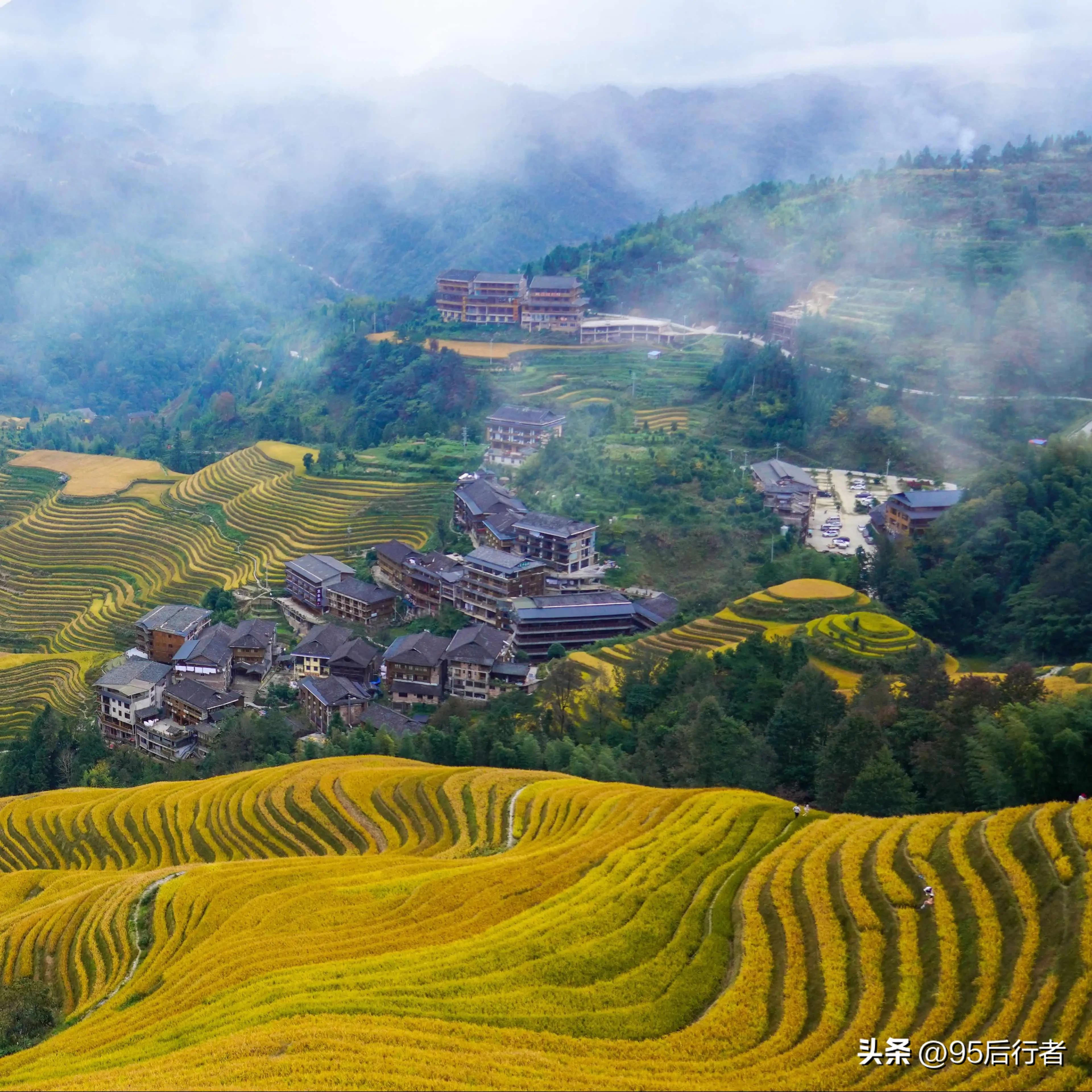 龙脊梯田,整座大山如同一座半圆形的大剧场,给秋天的龙脊梯田穿上了金黄色的外衣。清晨的云雾缭绕山间,仿佛诗意盎然。