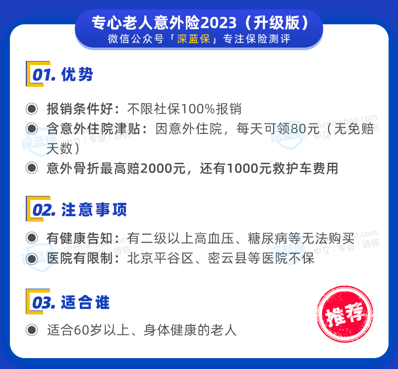 如果预算有限,也可以考虑天天保中老年意外险,70岁老人只需要138元,但它只能报销社保内的费用。