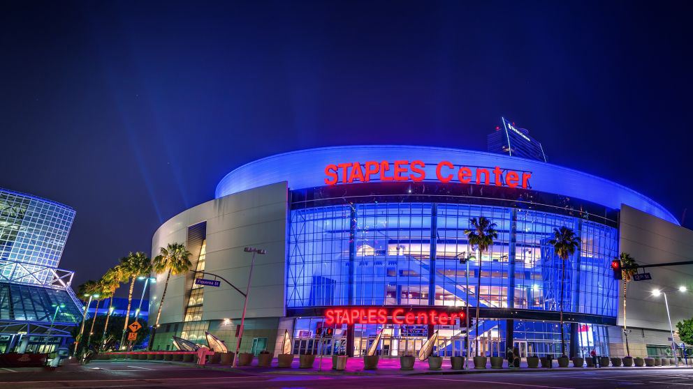 斯台普斯中心位于洛杉矶闹市区,是全美最受欢迎的体育中心之一,同时也是最星光熠熠的NBA球馆。它是NBA洛杉矶湖人队、洛杉矶快船队、WNBA洛杉矶火花队、NHL洛杉矶国王队、AFL洛杉矶Avengers和NBDL洛杉矶防御者队的共同主场,最大容量2万人,也是NBA唯一的两支队共用的球馆。