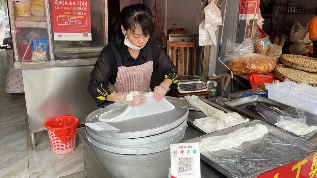 一个妇人用超大的金属锣盛着米浆上笼蒸六分钟,将薄薄的米皮小心地揭下来,再卷起来,用剪刀随意剪成不规则的小块,调上酱油、醋、辣椒油、酥黄豆、炸花生,最奇妙的是这碗剪粉里还加入捣碎的毛腊果,淡淡的酸味让人意外又惊喜。