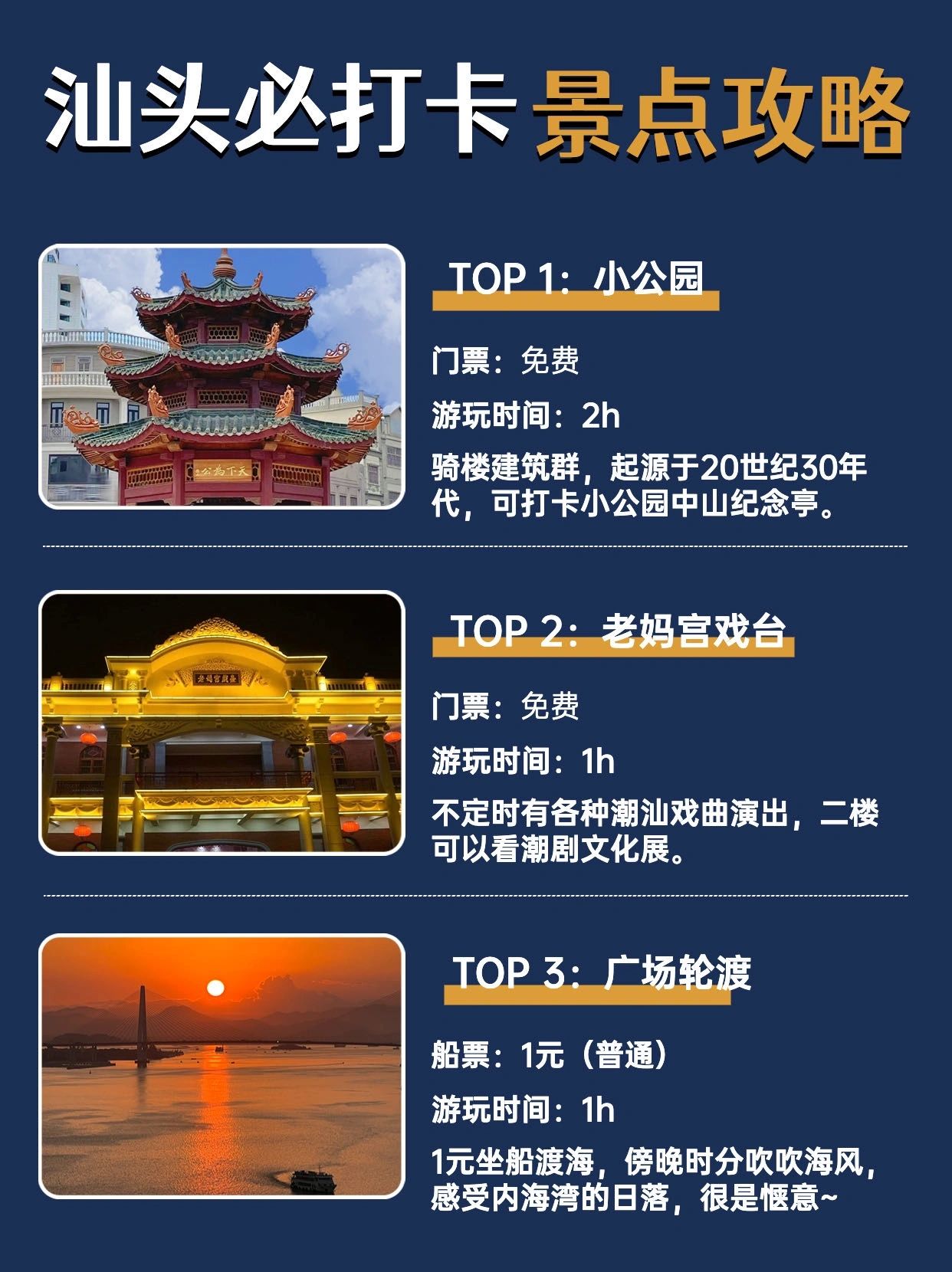 ⭕️ 汕头景点: 小公园、老妈宫戏台、西堤公园、妈屿岛(小南澳)、广场轮渡、潮博馆、北山湾泳场、东海岸公园、礐石风景区、南滨公园、儿童公园。