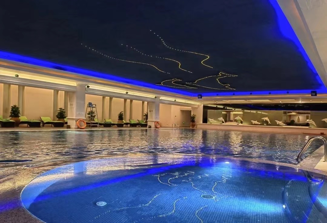 天气冷也不怕,恒温的室内泳池一年四季可以玩,看到天顶上的白海豚了吗?海悦山庄的吉祥物哦。