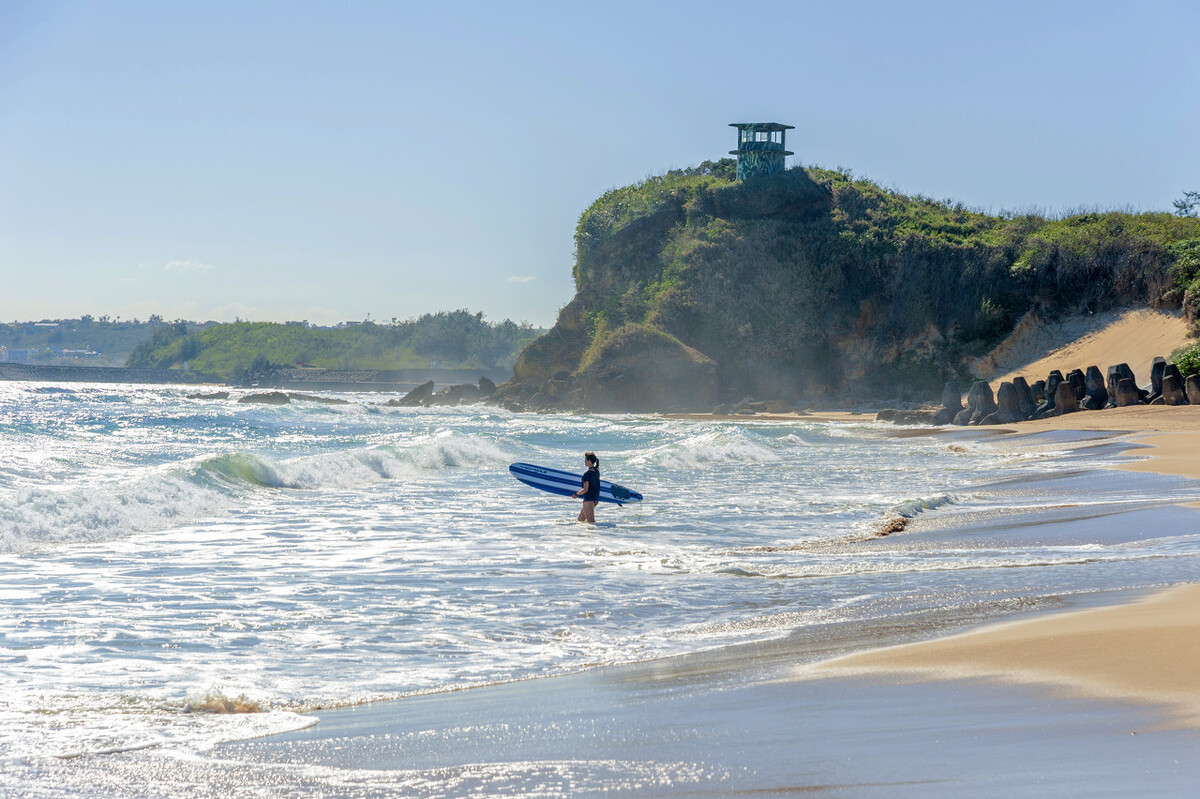 垦丁南湾是太适合发呆放松的地方,沙子和海水的质量都不错。冬日的暖阳轻柔地照在脸上,混合着来自海洋的清新氧气,让人不自觉地放松。隆起的海浪就像绿色的水晶般透明。不远处的弄潮儿正兴致勃发,进行炫技比赛。搭乘垦丁快线可以到这里。