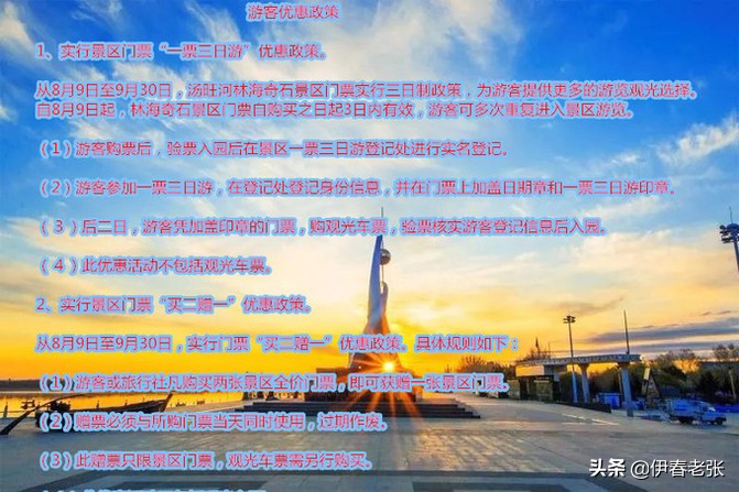 汤旺河国家公园(又称林海奇石景区,汤旺河石林)截止现在我还没有接到今年的梦幻森林夜景开放通知,是否会在十一期间开放目前还不清楚,喜欢森林夜景的朋友请合理安排行程,好消息是停止了两年的一票三日游的政策又恢复了,而且又推出了买二送一活动,