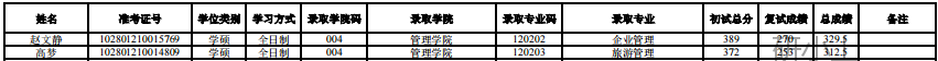 学硕管理科学与工程录取21人,最高分397,最低分345;会计学录取12人,最高分406,最低分371;旅游管理录取1人367分,企业管理录取10人,最高分413,最低分348。