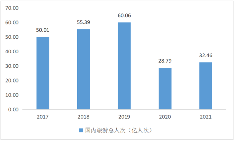 2020年以来,由于受到新冠疫情的影响,我国旅游产业受到巨大冲击,国内旅游在经受巨大冲击后仍仅呈现缓慢恢复的态势。截止2021年底,我国国内旅游市场游客总量及收入虽较2020年有所恢复,仍与2019年水平保持较大的差距。