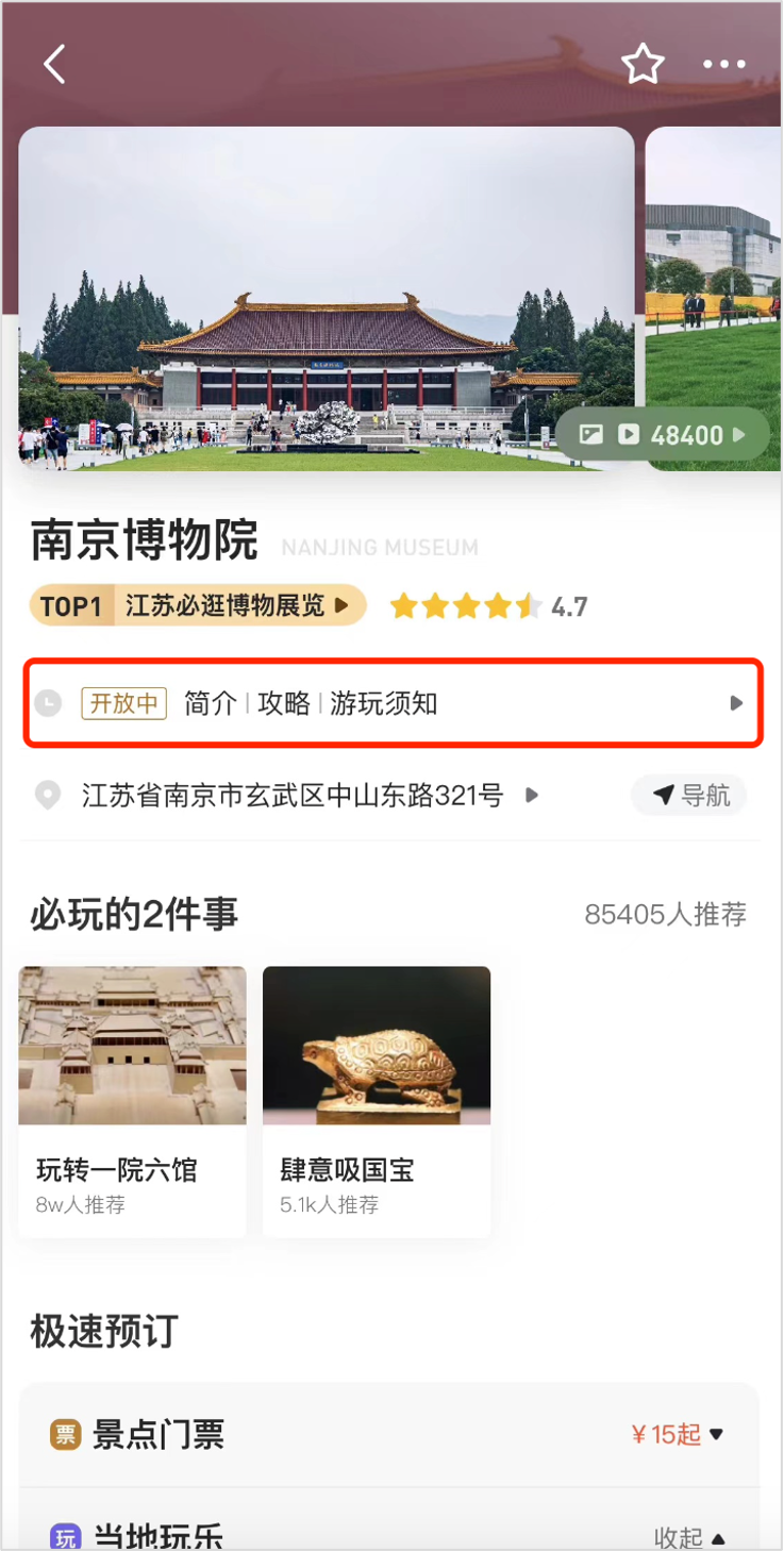 点击景区介绍页面我用红线框出的「简介|攻略|游玩须知」,看看这里都有什么。