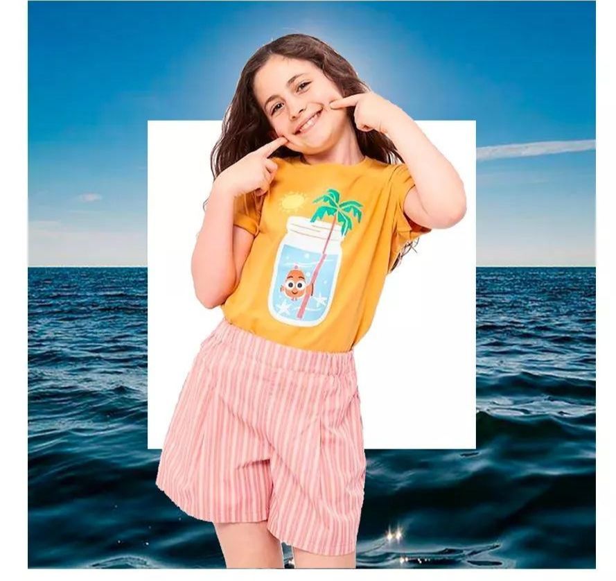 女生可以穿上一套柠檬黄的T恤,衣服上的印花图案是《海底总动员》里可爱的小丑鱼NEMO,下身则搭配一条嫩色的条纹短裤。