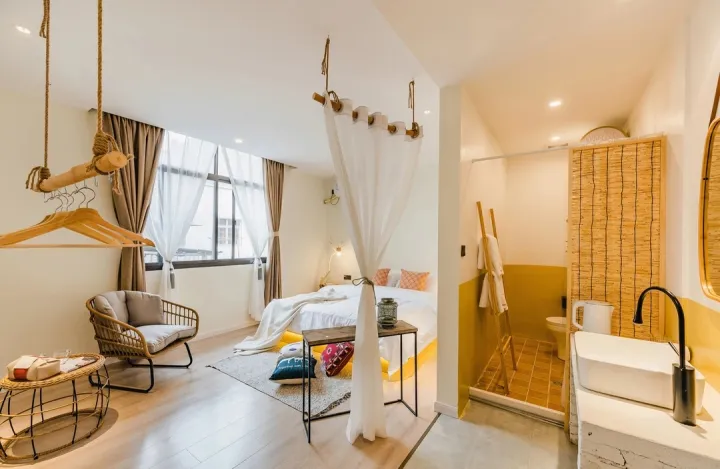 在一个小巷子里,闹中取静。装修于2020年,简约的摩洛哥风格,非常适合拍照。楼顶还有一个露台,晚上可以上去喝点酒,聊聊天。