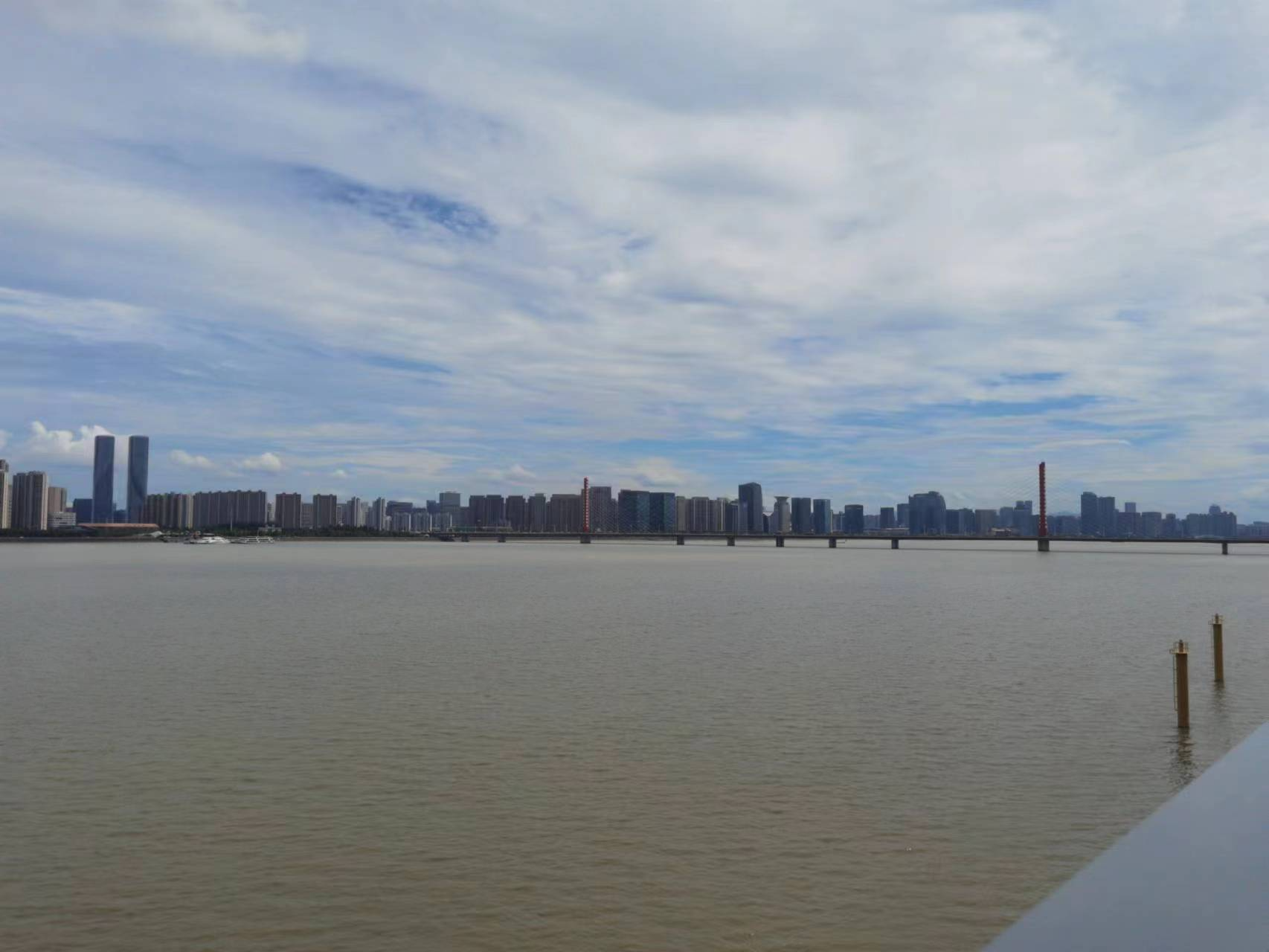 右边可以看到西兴大桥,也叫钱江三桥,很漂亮的两个红色斜拉索,晚上亮灯就是一座灯桥了,也是一大亮点。