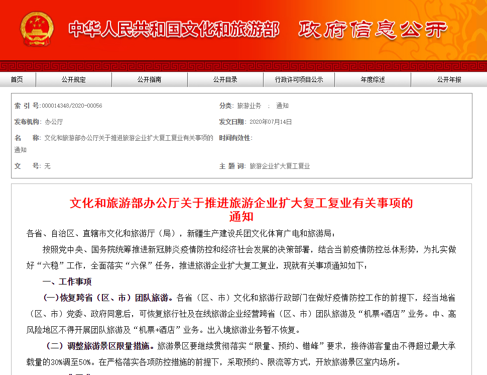 7月14日晚,旅游爱好者们迎来了久违的“狂欢夜”。文化和旅游部办公厅印发《关于推进旅游企业扩大复工复业有关事项的通知》(以下简称“《通知》”),暂停了172天的国内跨省(区、市)团队游,官宣回归。