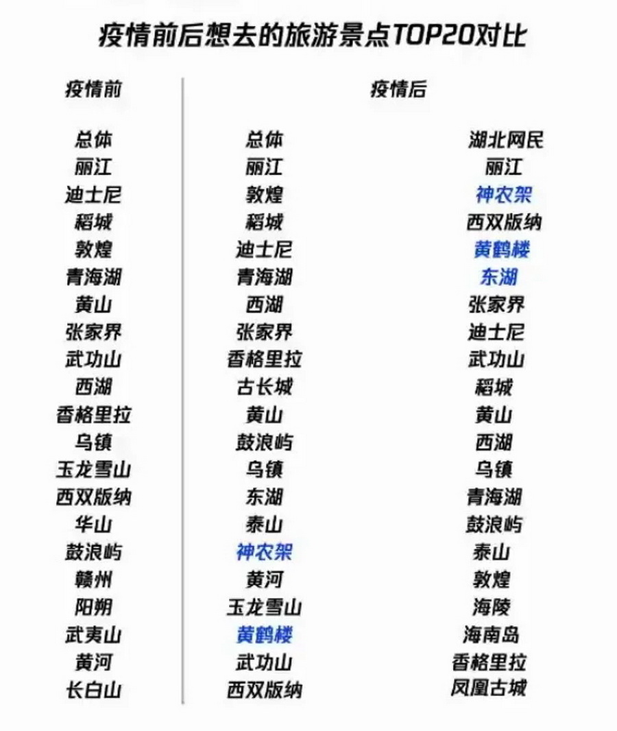 疫情前后,想去旅游的景点TOP20变化:神农架、黄鹤楼入榜。