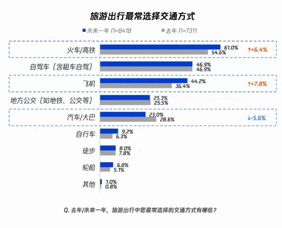 疫情后,旅游选择的交通工具,汽车、大巴明显减少,火车高铁、飞机显著提升。