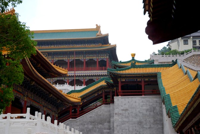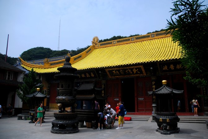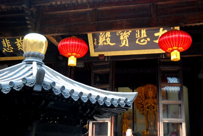 这座金碧辉煌的建筑就是九龙殿,也叫观音殿,檐角的九龙雕刻十分精致生动,殿内的九龙藻井及部分琉璃瓦从南京明故宫**而来,被誉为普陀山四宝之一。
