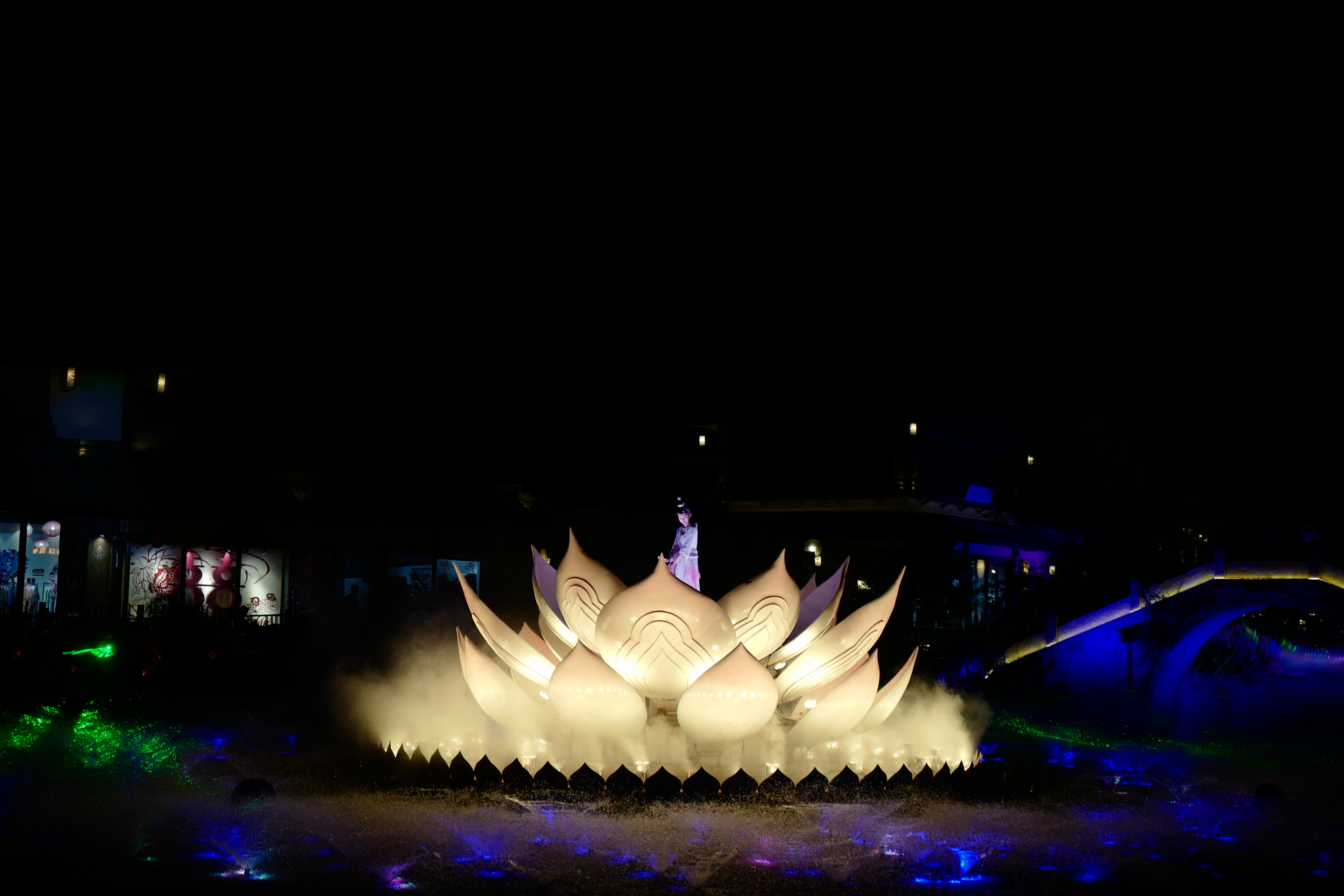 回程的路上风在耳边吹过,远处散落在草地上的月球状灯在白天看更梦幻,夜晚可以看花街的表演,而拈花塔是小镇最显眼的建筑,是一座唐风木结构楼阁式塔。直棱窗棂、重唇板瓦、尽显古朴典雅。