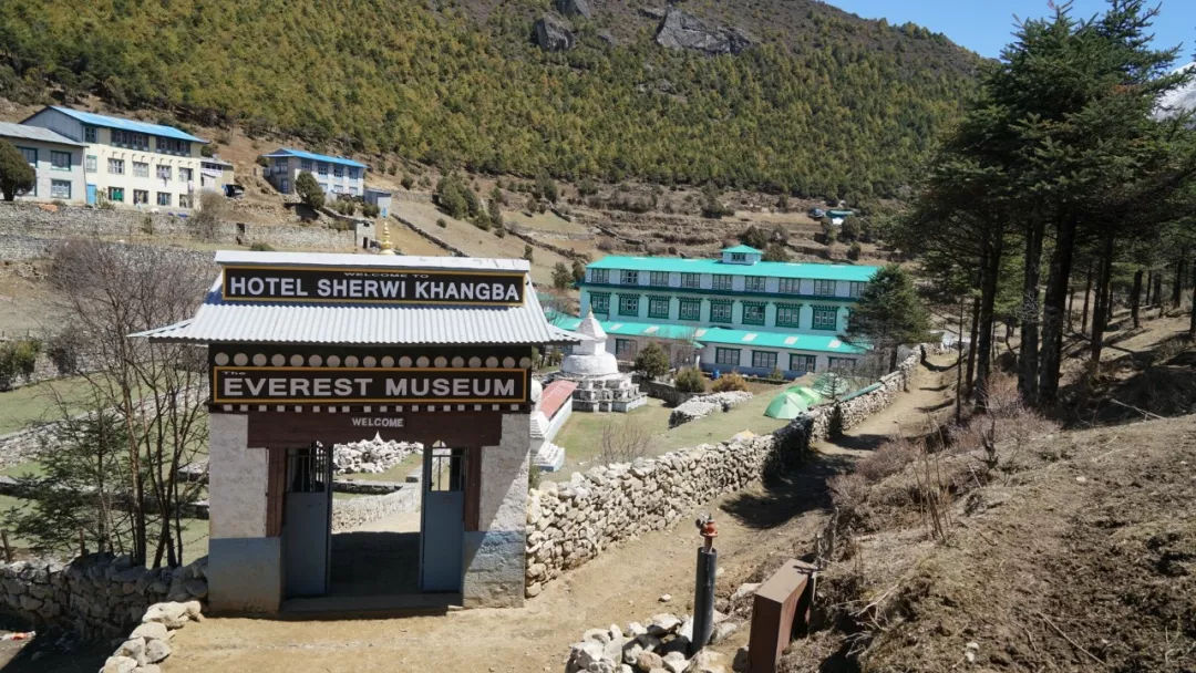 博物馆里面有珠峰国家公园的部分介绍,包括攀登路线、周边山峰等相关内容,博物馆外面还陈列着两块石头,旁边还有丹增夏尔巴的雕像,背后就是珠峰、洛子峰、努子峰,对面有观景台可以看到Phakding,也就是徒步进来的路,视野非常开阔。右边山谷山顶有一个酒店,这家酒店一晚190美金,需要乘直升飞机才能往返,单程飞机350美金,酒店可以看到Namche全景和珠峰。