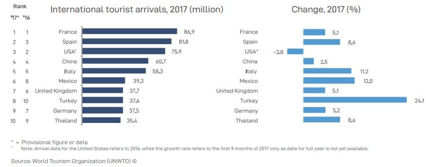 在这些旅游目的地国家中,法国入境人数最高,达8690万人次,较2016年增长5.1%,西班牙入境人数超过美国上升至第2名,美国入境人数较2016年减少3.8%,排在第3名,中国入境人数达6070万人次,保持在第4名。前10名国家的入境人数平均增速为7.86%,土耳其增速最快,同比增长24.1%,美国是前10名国家中唯一一个负增长的国家。