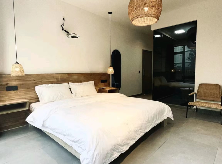 民宿于2021年开业,风格很典雅,跟周围的环境很搭。房间很新,有简约、中式、日式等不同的风格供选择。