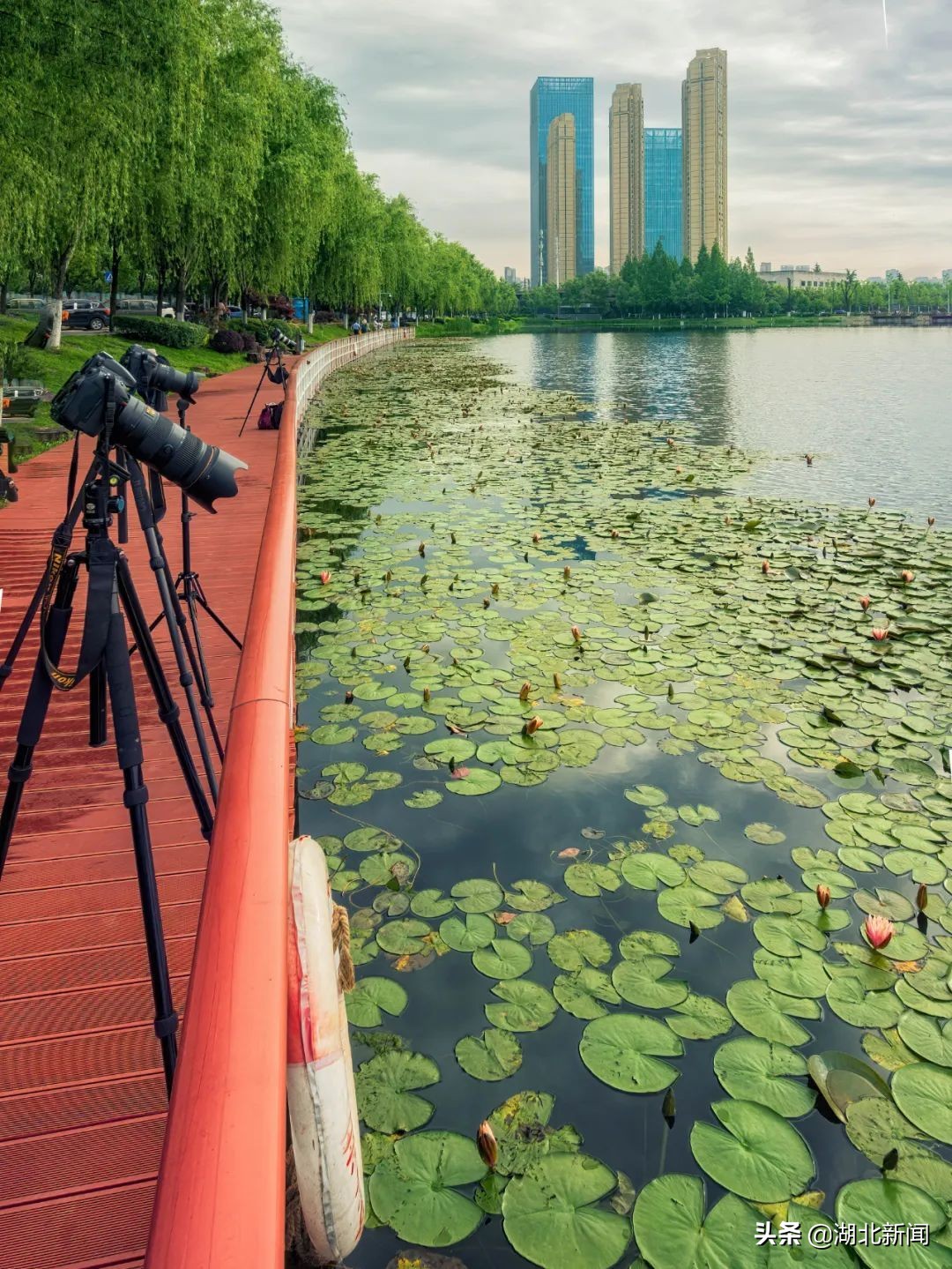 “五一”假期恰逢睡莲盛花期,武昌内沙湖的湖面上,睡莲每天早7时至9时左右开花绽放,傍晚时分闭合。湖边的亲水栈道供人们徜徉其间,赏花拍照,充满着《和睡莲》描绘的诗情画意:红粉伊人枕波眠,风掀碧裙任缠绵。水晶珠儿滚入梦,丝丝朝阳透绿帘。