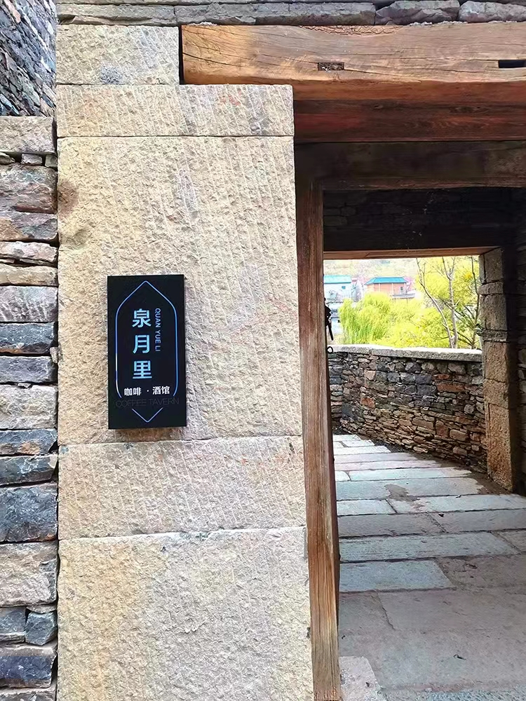 顺着泉水·食里餐厅外的石头台阶拾级而上,别进小巷,一道虚掩的柴门,四周围砌着原石,门旁挂着『泉月里』的牌子。