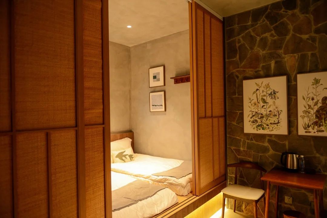 民宿院落的风格和命名也各不相同,「软光里」、「秘林之境」、「叠叠堡」、「暮韵」、「聆竹」等8套不同主题风格的民宿院落,只名字就给人远离尘世之感。