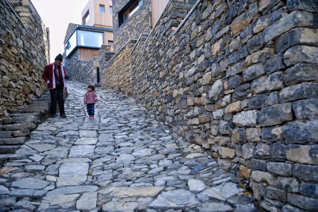 古朴的青石屋顺山势而建,石墙黛顶,偶尔间杂几栋红色屋顶,古朴中又焕发着生机,岁月为其留下了特殊的古老韵味。