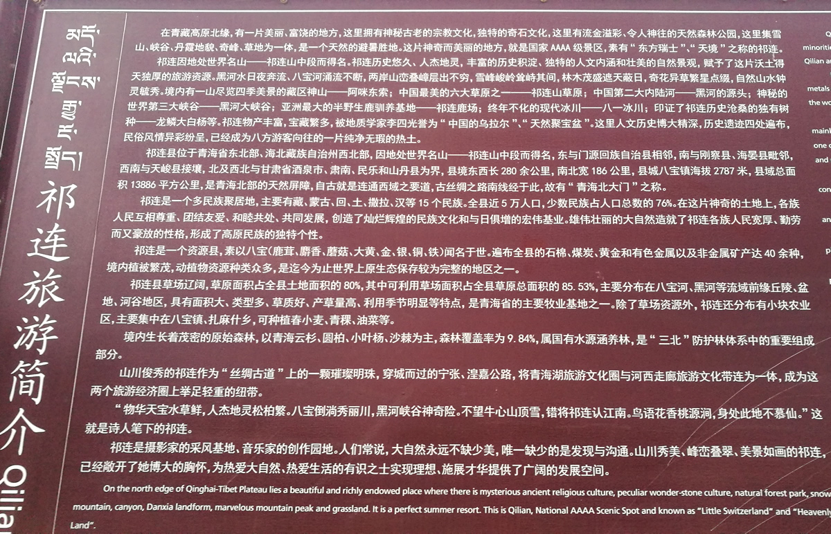 祁连县隶属青海省海北藏族自治州,因地处祁连山中段腹地而得名,北邻古丝绸之路甘肃河西走廊,故有青海“北大门”之称。